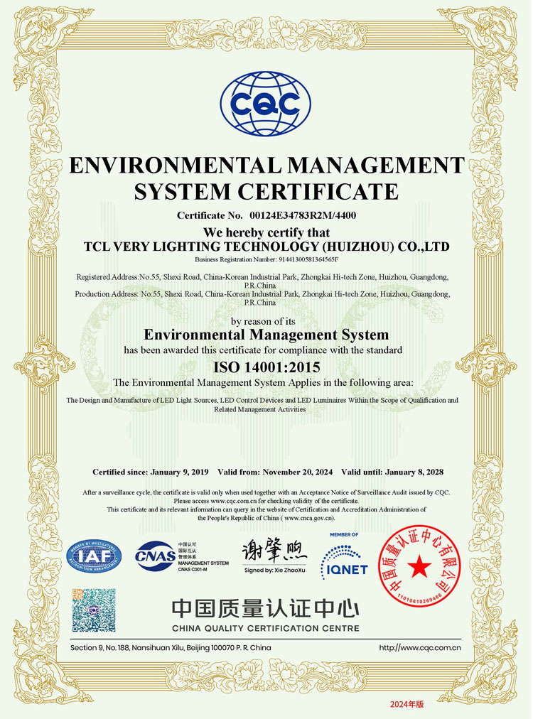 TCL华瑞照明 ISO 14001:2015 环境管理体系证书