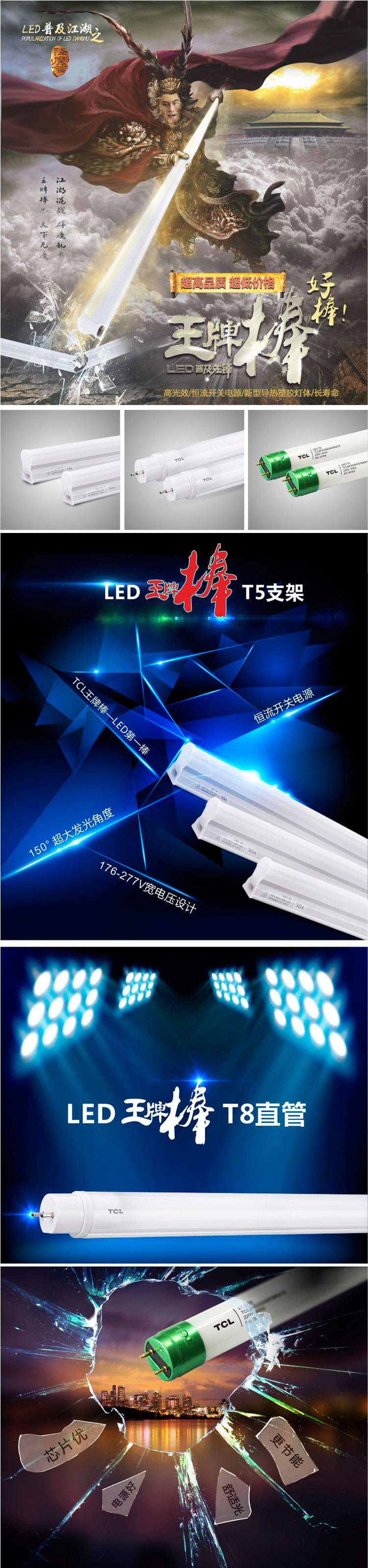1993年初, TCL集团凭着“敢为天下先”的创新意识,以性能、价格极其优越的大屏幕彩电切入市场,一举获得成功,塑造了家喻户晓的TCL王牌彩电地位。2000年6月,TCL进军照明行业,先后以超高品质、震撼价格的产品赢得了市场。其中TCL王牌棒家族照明产品如王牌彩电一样,发挥着英雄产品的杀伤力。选择TCL王牌棒,LED江湖不再有魔。