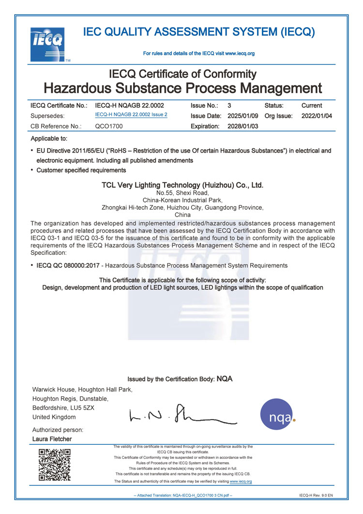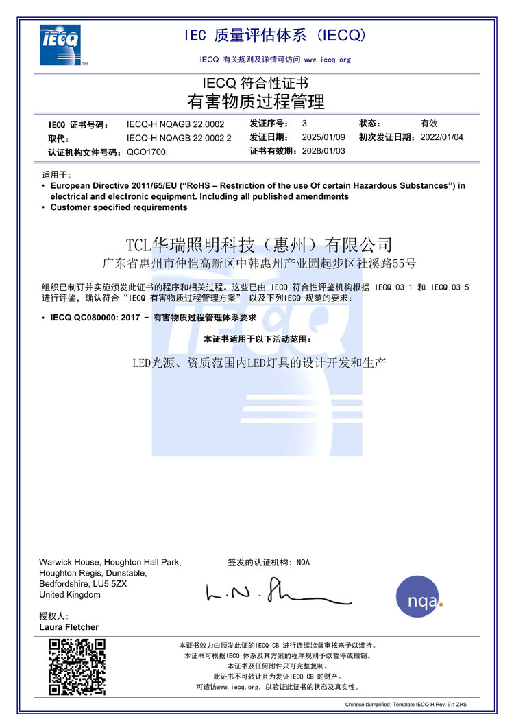 TCL华瑞照明 IECQ QC080000:2017有害物质过程管理体系证书
