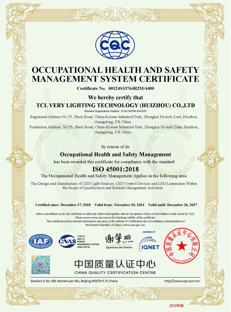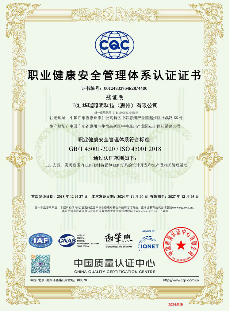 TCL华瑞照明 ISO 45001:2018 职业健康安全管理体系证书